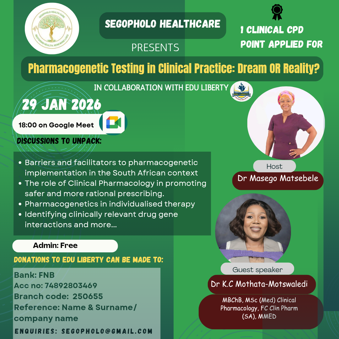 Discussions to cover: 1. Pharmacoeconomic implications of pharmacogenetic testing 2. The application of pharmacogenetic principles in preventing adverse drug reactions 3. Barriers to pharmacogenetic implementation in the South African context 4. The role of Clinical Pharmacology in promoting safer and more rational prescribing and more...